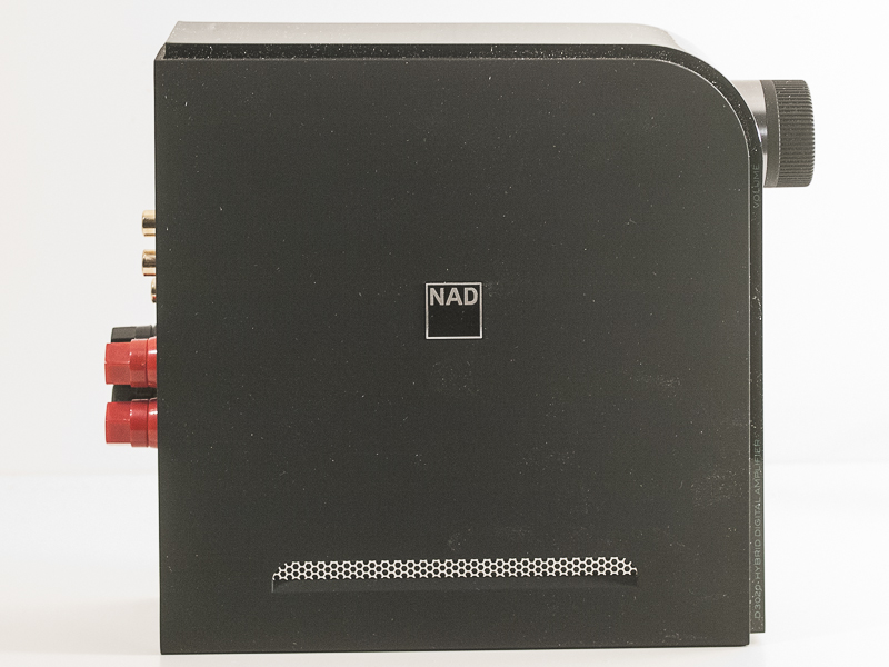 The weight of the NAD D3020 is 1.38 kg and it reveals essentially that, in addition to operating in class D also has switch-mode power supply. These are components of a structure that allows for low weight, and which have such high efficiency of operating temperature rarely poses a problem even in very compact constructions. D3020 is really compact, and has even smaller dimensions than I imagined before the first meeting. A width of 58mm and a total depth of 219mm, the way to the tip of the protruding volume control on the front and the speaker terminals on the back. Combined with the fact that it has a design that is ideal for vertical orientation makes this a discovery for those who are looking for an amp that hardly will appear in the landscape. No problem letting it slide imperceptibly into the bookcase between a leash with paperbacks. Or to give it space on the nightstand along with tumbler, alarm clock a few books and an iPhone.