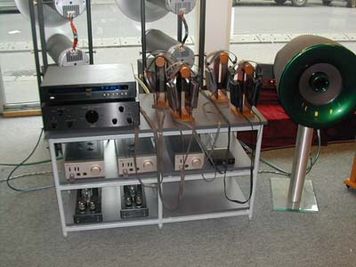 Eit anna godt og gammalt merke er Stax - mest kjend som produsent av elektrostatøyretelefonar, som er dei beste serieproduserte høyrelurar du kan få for pengar. Dyre om du ser på andre ting til å henge på hovudet, men om du vel utgåvene med eigne direktedrivne rørforsterkarar, får du ein detaljrikdom og ein nøytralitet INGEN andre lydformidlarar eg kjenner til kan klare (du bør lese omtalene våre her på http://www.audiophile.no) Ved sida av ser du det minste alternativet frå Avantgarde. Denne hornspesialisten har fått stort ry, men dette var mitt fyrste møte. Dynamiske kvalitetar eg ikkje har høyrt sidan eg fekk kose meg med Klipsch La Scala... Med baksida til ser du også ein større modell utstilt.