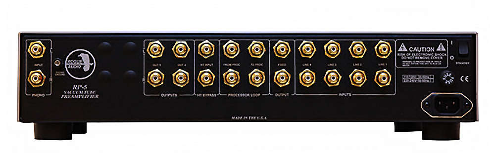 Rogue RP-5 has a tube driven headphone amplifier, and a RIAA stage for both MM and MC pickup. RP-5 has also an own processor loop, in addition to a HT bypass. The latter gives entry into our exclusive list of amplifiers with HT bypass .
