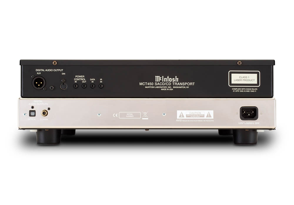 McIntosh MCT450 is a transport that can play CD and SACD. For CDs, you can choose between optical, coax and XLR outputs. If you want to play SACDs, you are dependent on using McIntosh`s special variant of digital DIN output. This interface can also be used to all PCM-based formats supported by MCT450 (CD / CD-R / CD-RW with Redbook, waw or MP3). But to use DIN transfer you depend on having a McIntosh digital processor at the other end, and you must use McIntosh`s special DIN cable. This protocol can also transmit multichannel DSD SACD, then transferred to an AV processor with digital DIN input.