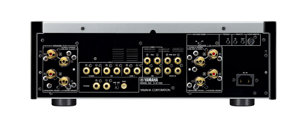 A-S1100 is still a pure stereo amplifier, without digital trends as we find in more amplifiers from other manufacturers. Three sets of ordinary RCA inputs as well as a tape in- and output. In addition, we find the input for both MM and MC. There is both a set of pre-out, and a direct entrance to the power amplifier.