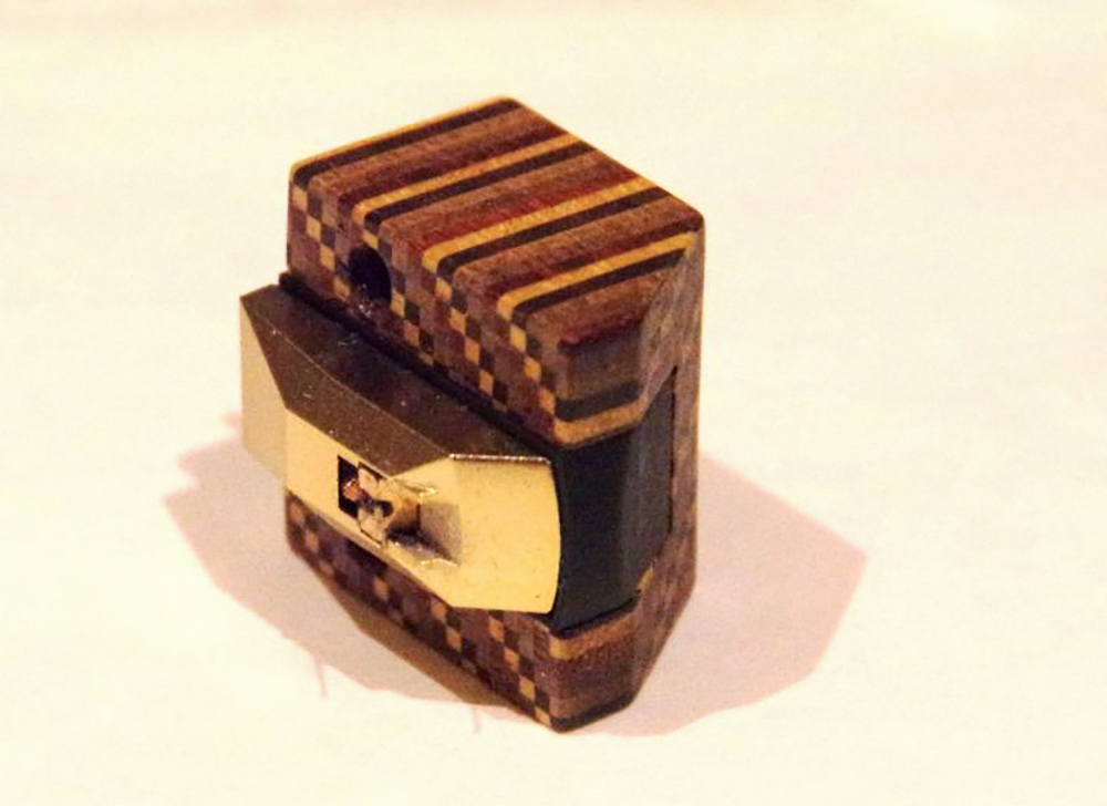 Dette synte seg å vere ein ombygd MC-sak, truleg frå Audio Technica. Akkurat kva som hadde skjedd inni med nålefane, stiftsliping og den slags, fann eg ikkje svar på. Men det iaugefallande var den spesielle ombygginga av kroppen, kabinettet til pickupen. Det er kledd med tre. Og ikkje berre eit trestykke, men ein vanvittig, nesten mikroskopisk mosaikk, eit hundretals små trebitar av mange ulike treslag, klistra saman med spesiell harpikslim til eit konglomerat.