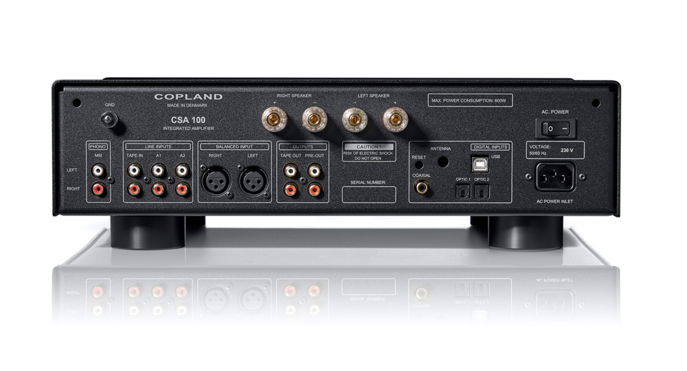 Vinylentusiastene får sine behov dekket. Det vil si – de som har en MC-pickup med low output må nok nyte medbragt RIAA. Av øvrige analoge innganger finner vi tre RCA og en XLR. Det er både tape-out og pre-out på CSA 100.