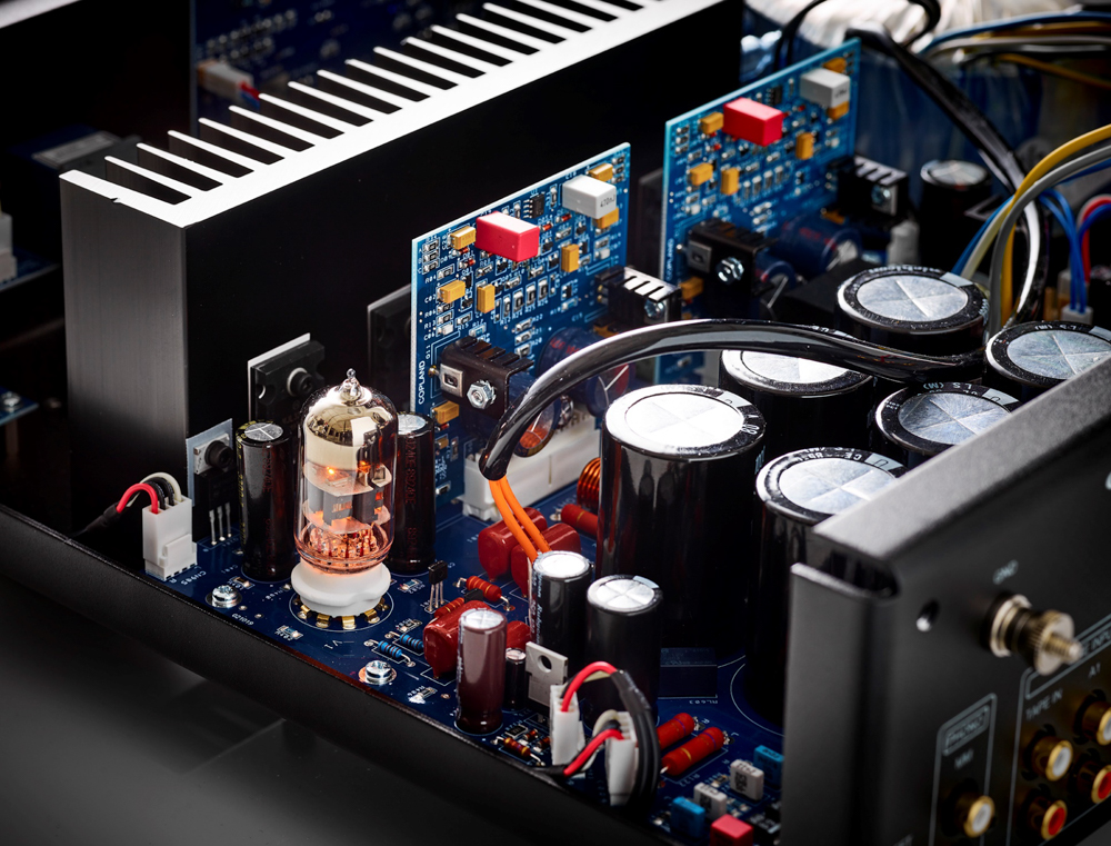 Nå er det den nye integrerte forsterkeren CSA 100 det handler om. Det er et enkelt rør som er ansvarlig for linjeforsterkning i denne konstruksjonen. Den doble trioden arbeider med høy spenning, og den tar seg bare av spenningsforsterkningen. Disse triodene får assistanse av en MOS-FET krets som driver utgangstrinnet og feedback.