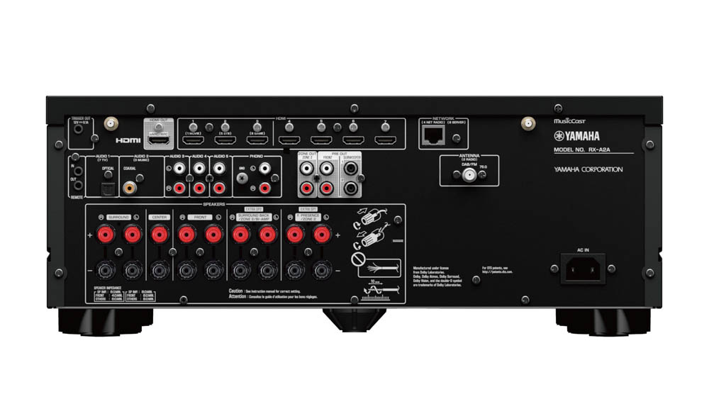 RX-A2A er en 7.2-receiver som yter 100 watt i 8 ohm med drift i to kanaler, og kan selvfølgelig konfigureres i et 7.2 eller 5.2.2-oppsett.