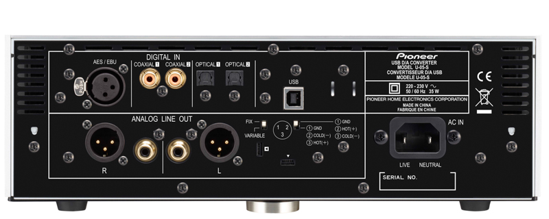 Pioneer U-05 has two coaxial inputs and two optical. In addition, we find a digital XLR input. USB-PCM takes up 32bits/384kHz, while the other inputs may take PCM up to 24bits/192kHz. USB input also takes DSD 2.8 / 5.6 MHz.