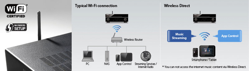 The biggest innovation is that the three largest models have built-in Wi-Fi, and this has for some strange reason been a rare commodity, even quite high up in price classes for both Yamaha and competitors. You have been obliged to buy a wireless adapter, or using wired connection - optionally a bridge solution. Another innovation is that it also offers Wireless Direct. This is a direct network established between the Receiver and Transmitter. It provides additional flexibility by allowing you to operate wireless even in places that have not established a wireless router, or where the capacity or range of your wireless network creates limitations. A small step for Yamaha - a giant leap for mankind! The three highest modlels in the budget series has Wi-Fi and Wireless Direct.