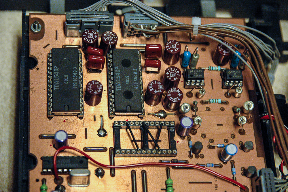 Det byrjar å verta komplisert dette, og det vert verre: Kva pokker er oversampling? Eg har prøvd å lesa meg opp på feltet, men har ikkje vorte veldig mykje klokare så langt. Den opprinnelege DACen til Philips, TDA 1540, er faktisk 14-bit, medan dei japanske konkurrentane lanserte 16-bits DAC-ar. Dermed tapte Philips spesifikasjons-krigen. Dei lanserte 4x oversampling, og kom slik på ein elegant måte opp på same oppløysinga som 16-bits DAC-ar. Men mange meiner at dette ikkje er til bate for lyden, og at det var noko Philips var pressa til å gjera - mot sin vilje. Det er difor populært å FJERNA oversamplinga, og dette er gjort med begge desse Philips-modellane. Eg har teke eit bilete som syner dette: Ein chip er fjerna og erstatta med lus (leidningar). (Den nyare chipen, TDA 1541, er 16-bit).