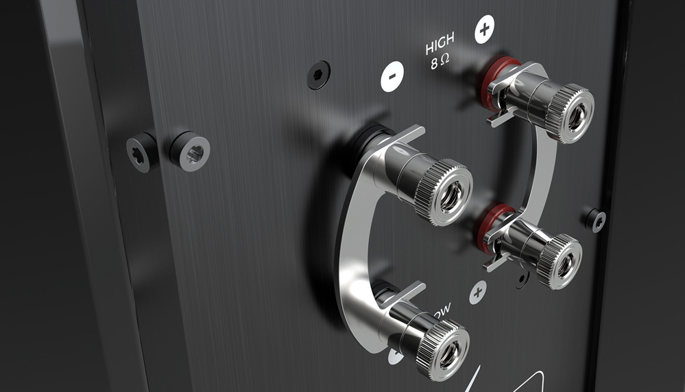 Terminalplaten er laget i anodisert og børstet aluminium, og er ekstra stor for å gi plass for delefilteret som sitter umiddelbart innenfor bakplaten.