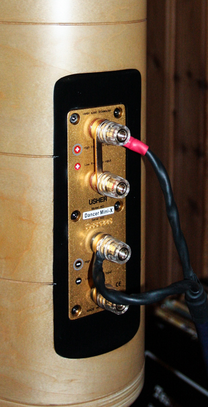 Usher Mini X virker på meg som en svært så solid bygget høyttaler og knoketesten gir ingen hørbare svakhetstegn, ser man i Usher sin brosjyre kan man se at det er brukt tykk MDF med avstivinger på kryss og tvers - det kan neppe gjøres stort bedre vil jeg tro. Solide bi-wiring kontakter plassert ovenfor hverandre på den smale bakplaten (kabinettene er buet bakover). I det hele tatt oser hele høyttaleren av kvalitet, vil jeg påstå.