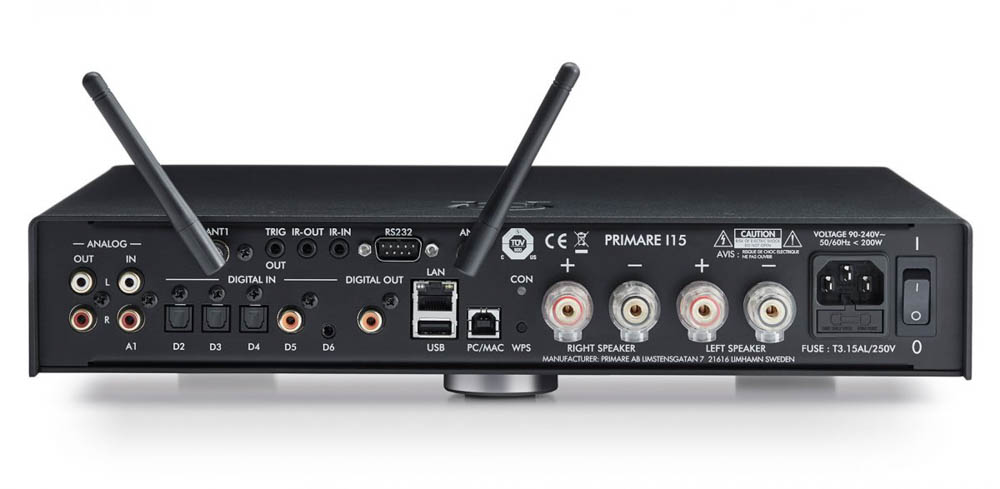 På baksiden av Primare I15 Prisma finner du to antenner, der den ene er for WiFi og den andre for Bluetooth. Dette at forsterkeren også har Bluetooth gir en ekstra fleksibilitet som kan være grei å ha. Den er ikke overdådig når det kommer til utvalget av Blåtann-kodeker – bare SBC er tilgjengelig. Men på en annen side er det ikke Bluetooth du velger for kritisk lytting, da er det mer aktuelt med AirPlay 2 eller strømming via Chromecast.