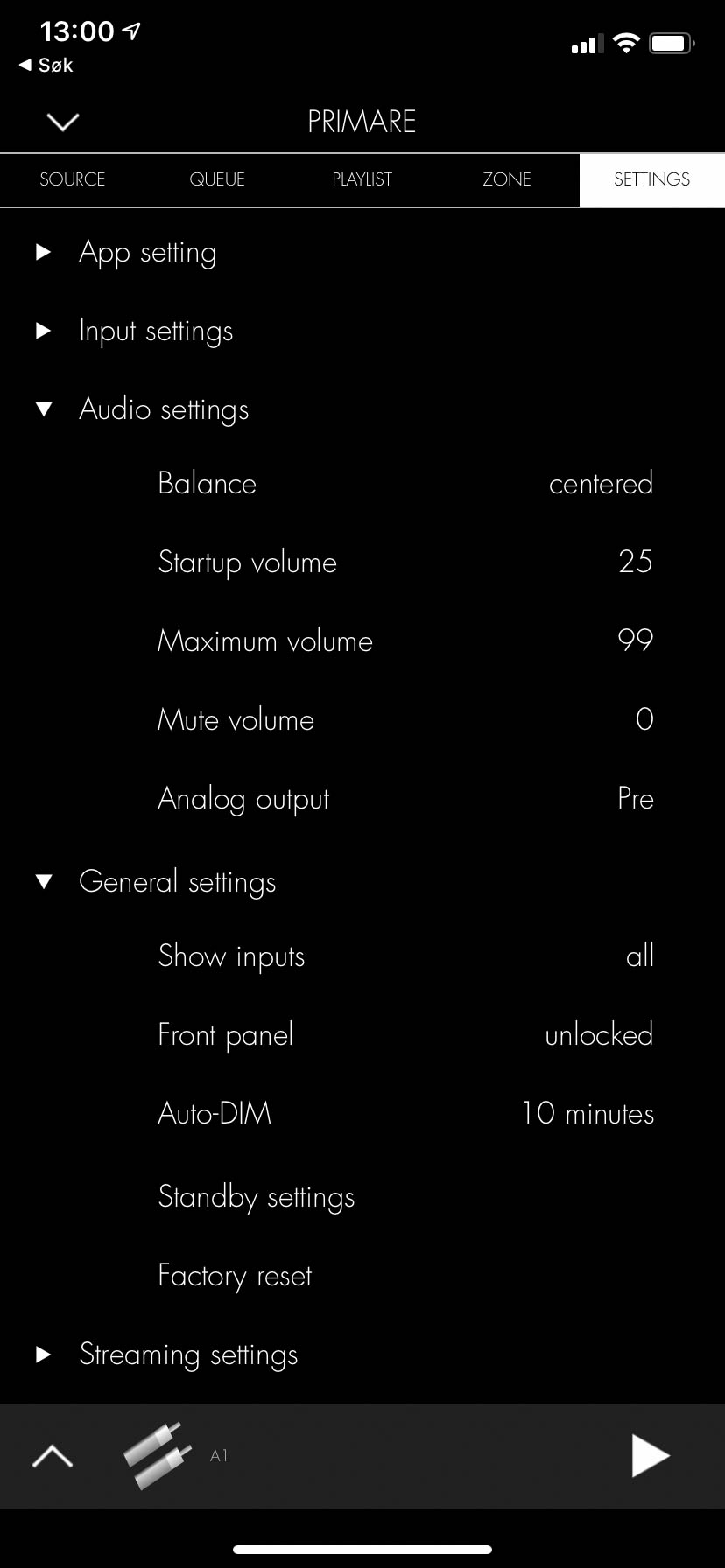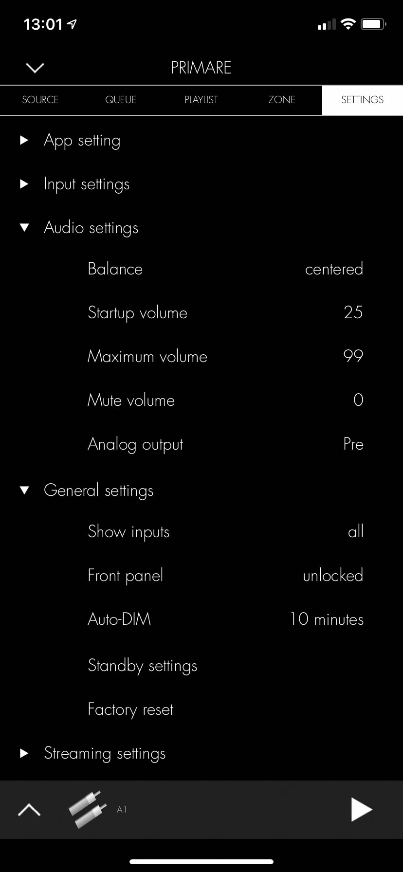 I første del av testen ble Primare I15 Prisma benyttet som en ren streamer/DAC, tilkoblet mitt oppsett via den analoge utgangen som for anledningen ble satt opp som Line-out. Denne utgangen er konfigurerbar, der valget står mellom pre-out og line-out.