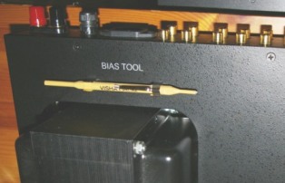 - Slå over brytaren til fyrste røret, og sjekk at biasstraumen står på 0,35 mV. Du må eventuelt justere denne med spesialskrujernet. Slå av brytaren når du er fornøgd.