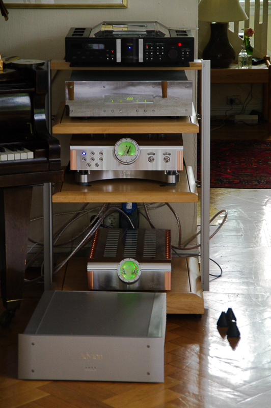 Aller fyrst hadde eg meg ein lynvisitt på ein times tid innom Stereofil, og fekk kalibrert hovudet til oppsettet dei har i butikken. Same høgtalarar som eg har heime, men i eit reint mbl-oppsett. Sjølv om demonstrasjonsrommet er i minste laget, og langt mindre enn mitt lytterom, er det svært god lyd å høyre. Og sjølv om romma er ganske ulike, er det greitt å oppdatere seg på lyden frå det reine mbl-oppsettet. Mbl er dyrt og stort, men til gjengjeld er du garantert å kunne drive mbl 101E med det… og då er det greitt å ha dette som samanlikningsgrunnlag når nye ting skal prøvast ut. Veldig tydeleg at sjølv om vesle Copland CTA 520 driv heimehøgtalarane overraskande godt, har han alt for lite krefter til å gjere jobben fullt ut. Bassen er kanskje største mankoen, kjem det for ein dag når eg sit i butikken med så mykje krefter at det skal svært lite til å overloade rommet.