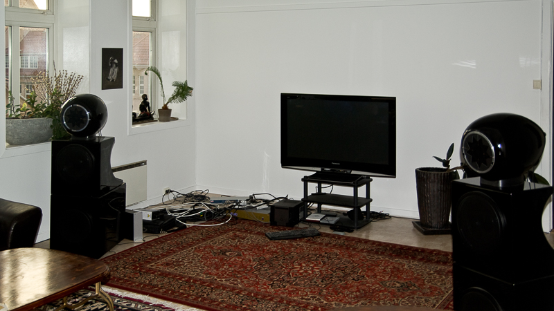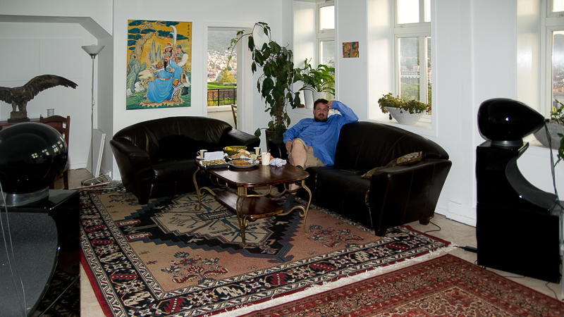 Eg fekk også høve til å møte ein av dei som markerer seg på Hifisentralen med sterke meiningar, Dephnot. Ein livsnytar i særklasse, ikkje alltid like enkel å verte einig med, men levande interessert i alt som er godt, særleg når det gjeld lyd og mat. Eg navigerte meg fram til bustaden hans, og fekk sjå fantastisk bergensutsikt frå ein ganse så uvanleg vinkel. Eit stort og godt rom, som også hadde spennande lyd. Deffe spelar fulldigitalt frå data, og med eit svært spesielt anlegg. Dei eksotiske høgtalarane hans var kjøpte brukte. Dei har Manger-element, men også to 15” element, der det eine spelte mellomtone i ei bipolar ramme, medan det andre spelte bass i eit lukka kabinett. Anlegget var fullstendig utan delefilter, men det var til gjengjeld seks klasse D-forsterkarar, ein til kvart element. Men før signalet kom fram til desse, vert lyden individuelt equalisert via pc over heile linja. Dette er uhyre komplisert, og det hadde ikkje lukkast å få til skikkeleg frekvensgong og dynamikk. Til gjengjeld baud anlegget på holografiske kvalitetar som sjeldan kan opplevast uansett pris. Dette merkelege anlegget er ei kjempeutfordring, men har også eit potensiale som er heilt i samsvar med den jobben som må gjerast.  Deffe har planar om å flytte på seg om ikkje så lenge, så det vert ikkje finjobba i det lytterommet han skal flytte frå om ei tid. Men når tida er inne, vurderer han å få tak i spisskompetente folk som kan hjelpe han med å få orden på detaljane.