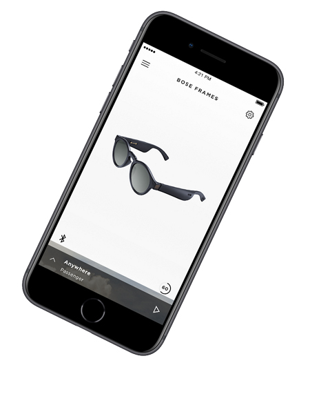 Du kan spille på Frames fra hvilken som helst app på mobilen. Styringen skjer via en multifunksjonsknapp på brillestangen, men hvis du vil utføre mer detaljerte innstillinger kan du benytte Bose sin egen app, som får en egen avdeling for Frames.