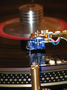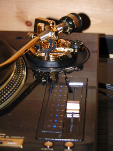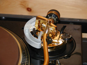 Du ser det runde loddet fastskrudd på toppen av pickupshellet. Her med Denon DL 160 i arbeid, som altså helst ikkje skal ha dette loddet påmontert. Claraudio sin dyraste platestrammar i bakgrunnen.