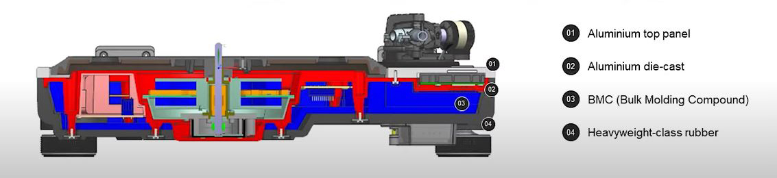 Chassis består av 4 ulike lag. Topplaten er i aluminium, mens vi under den finner et sjikt med støpt aluminium. Deretter finner vi BMC (Bulk Moulding Compound), mens det fjerde sjiktet består av tungvektklasse gummi. Frank Balzuweit i Technics Europe mener at disse fire sjiktene med ulike resonanser er avgjørende for å oppnå det han mener er et resonansfritt chassis.