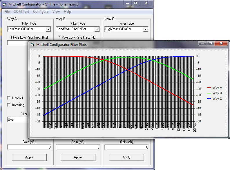 Konfigurering skjer via en windows-app, hvor man kan velge riktig filter-setup for hver modul, og sende frekvens- og dempingsinformasjon. Appen hjelper også til med å automatisk designe filter etter standardmodeller - Butterworth, Chebishev, Bessel. Filteret sin frekvensrespons kan vises i en graf, og endringer kan høres i sanntid.