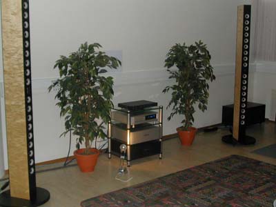 Eitt av dei definitivt mest spennande oppsetta Oslo HifiCenter hadde fått rigga i Vika konferansesenter (på den andre sida av gata), var dette anlegget som bestod av etterlengta, ny elektronikk frå Adyton, og høgtalarsett frå Trondheimsfirmaet Avideco. Desse høgtalarane er svært lovande, og demonstrerer til fulle dei mange kvalitetane line-sorce-prinsippet. Dei om rigga anlegget hadde tydelegvis brukt mykje tid, for lyden var svært open, lydbildet uvanleg tredimensjonalt, og dynamikken upåklageleg. Elektronikken gjorde nok sitt bidrag til den høge lydkvaliteten, men eit system der kvar hovudhøgtalar var utstyrt med banddiskant og 18 stk 7 1/2 cm, har nok mesteparten av æra. Frekvensgangen er oppgjeven til 80 - 50 000 Hz, og dei skal tåle 900 watt, medan dei spelar 94 dB/W. Den tilpassa subwooferen har 4 titommarar, innebygd forsterkar på 700 digitalwatt, og leverer frekvensar ned til 17 Hz på -3dB. Akkurat liten kan ikkje denne subben kallast - han er 70 cm brei, 30 cm høg og 40 cm djup, men det må til om bassen skal bli djup nok med tilstrekkjeleg kasse. Anlegget har ulike alternative utsjånadar, men flammebjørk er kanskje det flottaste? Prisen avspeglar nok kvaliteten, men om lommeboka framleis er tjukk etter jul, kan du prøve ut: www.avideco.no