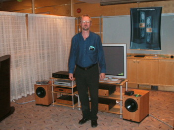 Peter Holstein frå Holfi har klokketru på SACD og multikanal, og kasta seg over meg som ein vestnorsk vekkjelsespredikant av argaste sort. Då vert ein lett skeptisk, og under demonstrasjonen var eg ikkje heilt fornøgd. Eg hadde diverre lagt att nesten alle multikanalsSACDplatene heime, og kunne ikkje utfordre så lenge eg berre hadde ”software” i stereo, men anlegget med Usher høgtalarar og Holfi elektronikk hadde ikkje dei same kvalitetane som anlegget mitt heime. Eg måtte dessutan bruke eit system med psevdo-senterhøgtalar, sidan eg ikkje har høve til å bruke ein elektrostatisk senterhøgtalar i lytterommet mitt. Eg er slett ikkje sikker på om dette hadde ført til store forbetringar. Og så er det dette med alle vinylplatene, då…..Audio-Aktør-Terje var i ferd med å selje unna litt vinylplater, men eg fekk ikkje høyrt med han om han var overtydd om Peter sin bodskap…