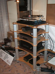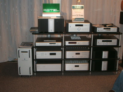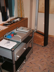 Her var rommet fylt opp av utstyr, også frå Yamaha som var ein av dei mange importørane som ikkje deltok på messa sjølve denne gongen. Det mest spennande frå André Zachariades var denne gongen JM Lab sine Grande Utopia med ei matchvekt på 210 kg pr kanal. For den med færre muskelmenn i familien kunne også Nova Utopia på berre 140 kg leverast. Begge desse hadde diskantelement i beryllium, som skal by på store lydlege kvalitetar og vere enormt driftssikkert. På dei rimelegare modellane var det også utvikla eit liknande element, men då ikkje i det kostbare beryllium-materialet. Diverre var ingen av desse kolossane rigga opp for å spele, så Hifihuset stilte ikkje denne gongen i konkurransen om beste messelyd… Av forsterkarar beit eg meg merke i ein mystisk sak som var stukken vekk på nedste hylle. Dette var ein integrert rørforsterkar med svært spennande design, og André kunne fortelje at dette var ein Chapter Audio Precise til rundt 50 000 kr.