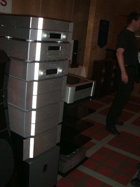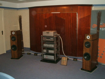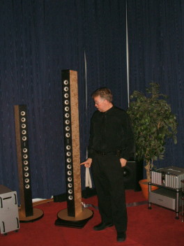 Men dei to topphøgtalarane frå T+A vart det ikkje høve til å lytte til. Svært synd, når eg har gjort meg opp lystne tankar på eit elektrostatelement driven av ein OTL rørforsterkar over 400 Hz, medan bassen sikrast av ein ekte transmisjonslinjekonstruksjon…Geir kunne likevel trøyste meg med at ein annan spennande høgtalar var like rundt hjørnet, fulltoneelektrostatar frå Audiostatic, som OHC no skal importere. Eg tinga meg straks for eit sett til utprøving….. Eg fekk også høve til å komme inn i det aller heilagste, der Adyton, Burmester og ikkje minst topphøgtalarane frå Trondheimsfirmaet AVIDECO. Desse nesten to meter høge linjekjeldekonstruksjonane (line source) kosta 140 000, og treng understøtting av subwooferar, då dei ikkje arbeider under 80 Hz. Høgtalarsettet består av imponerande 9 element pluss banddiskant pr side, og har svært lite delefilterkomponentar som kan påverke lyden negativt. Likevel var det mange justeringar, slik at tilpasningar til rom, smak og utstyret elles lett kan gjerast. Det vart også synt fram ein mindre høgtalar, med litt færre element, som ”berre” kosta 100 000, og som ikkje var så høge som storebror.