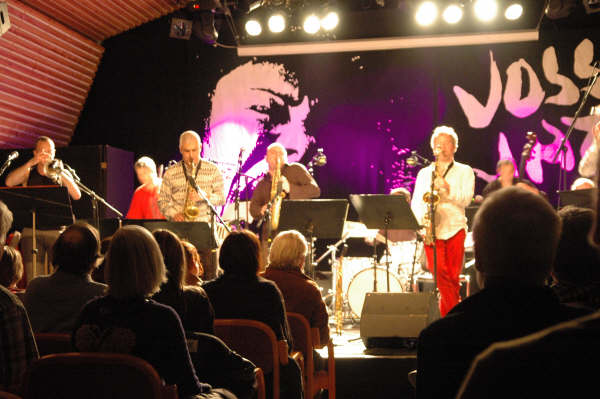 Den offisiellle opninga, i år som i fjor, var i Vossasalen, det nye flotte tilbygget bak Park Hotell Vossevangen. Dette har på ein måte vorte Voss si nye storstove, og har alt hysa konsertar med mange kjende namn, jazz eller ikkje. Også i år opna Ivar Kvåle festivalen med luren sin, og det er lika vakkert kvart år. Det fyrste biletet med den blå bakgrunnen er derifrå. Jon Skjerdal sto for den offisielle opninga, knakande morosam som vanleg, og Arne Hjeltnes fylgde godt opp med underhaldning i rein stand-up stil. Mykje betre enn politikarar med flosklar om jazz, som dei vanlegvis overhovudet ikkje har greie på, og som aldri kan verta ferdige. Men dei er Vossajazz ferdige med, heldigvis.