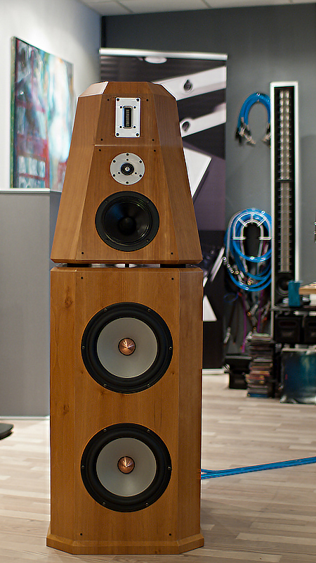Neste stopp er et par Wisdomhøyttalere. Linjekildehøyttalere som hevdes å være lette å plassere. Videre ser vi på et par høyttalere fra Von Sweikert som er laget for å stå opp mot bakvegg, fra 7-50 cm fra bakvegg sier Roald. 2 stk. 6,5-tommere og en ringradiator er forovervendt, mens en 10" bass er bakovervendt. Og til tross for det er det veldig presis og veldefinert bass, hevder Roald. Egenimportert elektronkk fra NuForce har vært et sentralt produkt hos Renaissance Audio.