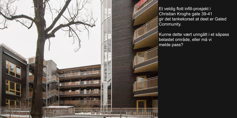 Og nettopp derfor er det et kraftig tankekors at prosjektet er en GC. Uteplassen åpner seg visuelt mot nordvest der legevakten ligger, men det er også et transparent gjerde der som hindrer tilgjengelighet. Mot den sterkt trafikkerte Christian Krohgs gate er det en trang portal, og denne er steng med en låst port.
