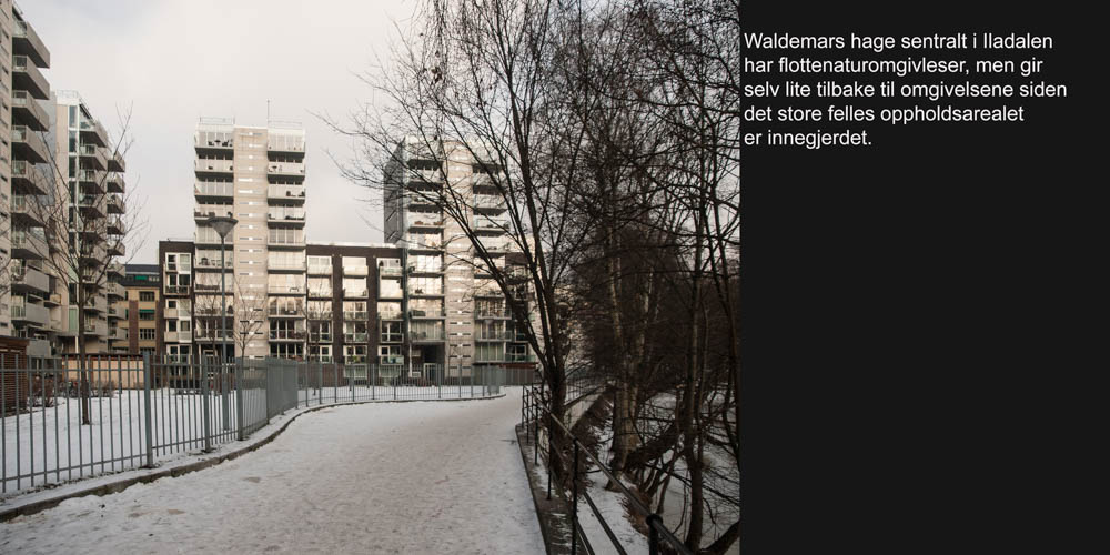 Lengre oppe langs Akerselva, og fremdeles på Oslo østkant avdeling vest finner vi prosjektet Waldemars Hage. Et ganske stort boligprosjekt som grenser til det parkmessig opparbeidede beltet langs elva. Det som er litt spesielt for dette prosjektet er at det har et parkmessig fellesareal som er mer enn vanlig (visuelt åpent) men til tross for det har det en lukket innhegning. I dette tilfellet er det svært mye mindre selvsagt at det ville kunnet fungere bra også for beboerne dersom dette fellesareal var allment tilgjengelig. Kritiske røster hevder at prosjektet Waldemars Hage benytter seg av de kvalitetene som nabolaget gir, men uten å gi noe tilbake til fellesskapet. Til W.H. sitt forsvar kan man kanskje si at hageanlegget til dette prosjektet tilfører en visuell kvalitet til fellesskapet. Men det er ikke et tilstrekkelig argument til å forsvare lukking av hageanlegget.