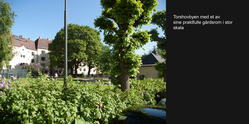 Beveger vi oss enda lengre mot Nord, og samtidig krysser Akerselva, kommer vi til Torshovbyen og Åsen, bydeler planlagt av Harald Hals på 20-og 30-tallet. Disse bydelene har en bebyggelse som både har innslag av nyklassisisme og funksjonalisme, som et resultat av den stilmessige epoken det var bygget i. Lang viktigere i denne sammenhengen er at det er en storstilt bebyggelse som har veldig mange flotte gårdsrom. Gårdsrommene skiller seg også fra tidligere tiders typiske bakgårder med å ha en større, åpnere skala, og at de ikke er parsellert – sistnevnte åpenbart også et resultat av utbyggingstrukturen.