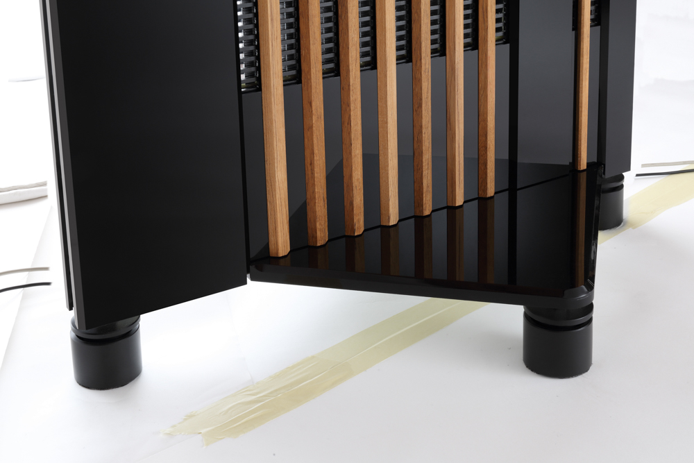 Standard farge/finish er svart høyglans akryl med ekte, naturlig teak profiler.