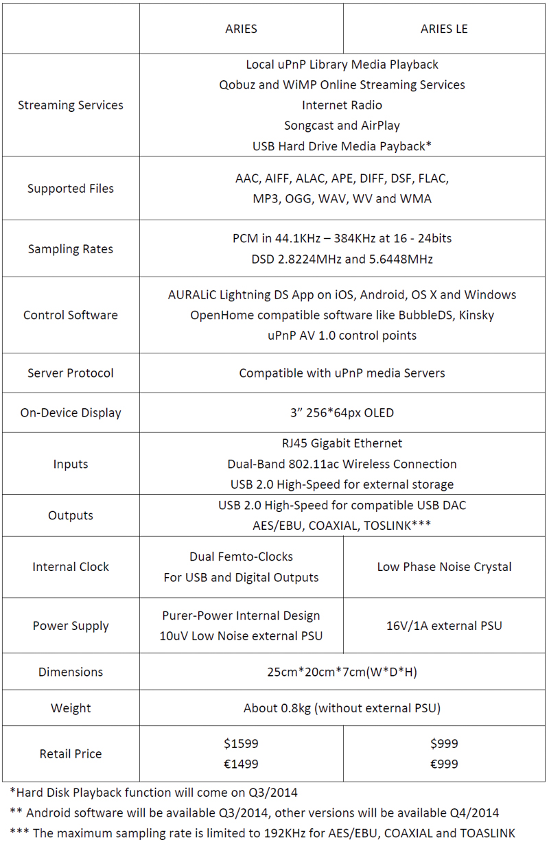 Aries kommer i to utgaver, der basisversjonen heter Aires LE, og en mer påkostet utgave heter Aires. Litt motsatt det man forventer, men jeg advarte om at AURALiC skiller seg ut. Det gjør de forresten også ved at de ikke har innebygget DAC. Dette er en ren digital streamer, eller streaming-bridge. Til gjengjeld later det til at AURALiC satser på svært høy kvalitet og kapasitet i streamingdelen, noe som er nødvendig for å streame DSD og DXD.