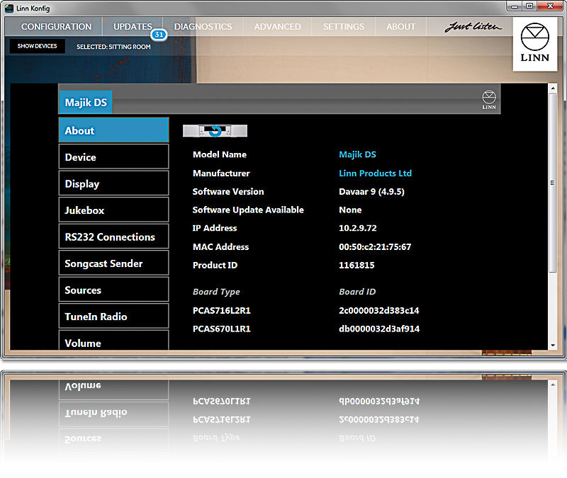 Dette har utviklet seg til å bli en god sentral for konfigurering av DS-oppsettet, inklusiv en del eksterne forforsterkere fra Linn. Gjennom dette småprogrammet kan man administrere og vedlikeholde DS-spilleren og Kinsky. Man kan også konfigurere en del oppsett i forforsterker, men de dypereliggende innstillingene må fremdeles foretas direkte i forforsterkerens oppsettmeny. Dette er et savn, spesielt for de av oss som har en mulitikanalsprosessor fra Linn i oppsettet.
