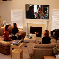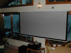 Ein tradisjonell TV er ikkje aktuell løysing. Så langt har eg heller ikkje funne TV av noko slag fullverdig til heimekino. Sjølv om dei er gode, kan ikkje dei største plasmaskjermane samanliknast med kino, det vert noko anna - nemleg TV. Godt til Dagsrevy og Barne-TV, men altså ikkje kino. I mitt tilfeelt tek TV-apparart dessutan for stor plas i rommet, og ein skjerm må eventuelt hengast på veggen, noko som på grunn av dei store vindaugsflatene ikkje er lett å få til med fornuftig plassering. Dessutan kostar store skjermar ganske mykje. Eit lerret og ein prosjektør vert faktisk rimelegare. Og så lenge rommet er mørkt nok, vil dette gje langt betre kinooppleving enn ein TV, same kor god denne er. Problemet vil vere når sommaren kjem, og det vert uråd å blende av glasverandaen skikkeleg – men vil vi sjå film om sommaren? Uansett: det spørs om det ikkje er behov for ein relativt lyskraftig prosjektør. Plassering av prosjektøren må også kunne gjerast fornuftig – eit opphengingssystem frå taket vil gjere at det ikkje er så lett å fjerne prosjektøren frå rommet. Takhøgda er 3,8 meter på midten, så det passar ikkje særleg godt å henge denne i taket. Det ideelle er plassering i trappa, men då vert han ståande asymmetrisk, dersom lerretet vert plassert midt på langveggen. Heng lerretet her, vil det også fungere som rullegardin, og blende av ein god del av lyset. Vanleg keystone-funksjon vil ikkje løyse problemet med asymmetrisk plassering, men det skal finnast prosjektørar som kan kompensere for dette.Når det gjeld lerret, er det mange råd å få. To med ganske motsatt forteikn: