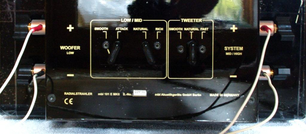 Så må det jobbast med plasseringa. Dei færraste eigarar av høgtalarar i sekssifra prisklasse har vel høgtalarane klistra opptil bakveggen. Men mbl 101 E2 må langt ut på golvet. Du kan rekne med at dei treng minst ein meter frå alt anna rundt seg, og spesielt det som er 50 cm over golvet. Utgangspunktet er at avstanden mellom høgtalarane bør vere mellom 2 og 3,5 meter, og at høvet mellom avstanden til bakvegg og avstanden til sidevegg skal vere 1: 1,32. Du bør såleis ha eit rom som er minst fire meter breitt, og det må vere råd å jobbe intenst med flytting av høgtalarne. Eg plasserte dei på handkle slik at det var lett å drage dei 85 kiloa fram og attende, i den perioden eg gjorde ørsmå justeringar. For det er ein god del å hente på dette. Eg trur 101 er vanskelegare å plassere enn dei mindre modellane. Det skjer iallfall mykje med mellomtonen når du held på med plasseringsarbeidet. Den digre ”melonen” som tek seg av dette frekvensområdet er unik for dei to største modellane. Veldig gode dei mindre modellane også, men det var altså etter å ha høyrt 101 E2 eg fann ut at det mått bli mbl for meg. Sjølv om dei mindre høgtalarane sikkert er lettare å plassere.