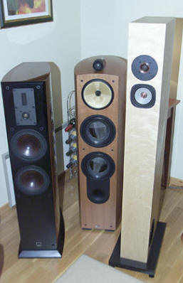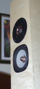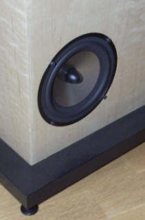 Denne høyttaleren er noe spesielt bestykket. En 1" diskant fra Seas, en 4" mellomtone fra SEAS og 2 6,5" basser også fr a SEAS. Ikke akkurat store elementer!  I tillegg er bassene montert rygg mot rygg helt nederst på sidene av det langstrakte kabinettet og bassrefleksporten er på undersiden av høyttaleren. Det er 1 meter fra mellomtonen ned til bassen...