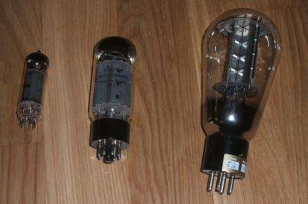 Vi ser her tre ulike utgangsrør. Heilt til venstre det vesle EL84 som er brukt i denne JoLida-forsterkaren. Nesten like lite som dei små triodene som brukast i forforsterkarar, men likevel i stand til å levere 2x20Watt når du har fire av dei. I midten det eg trur er det mest utbreidde utgangsrøret EL34, som er svært musikalsk, leverer ganske mykje effekt (du får gjerne 2x50 Watt ut av fire sånne) og føretrekkjast både i gitar- og hifisamanheng. Heilt til høgre den store trioda 300B frå Golden Dragon - eit legendarisk rør, med fantastisk lyd, men ikkje spesielt effektivt - du får ikkje særleg meir ut av dette i effekt enn med det minste røret.