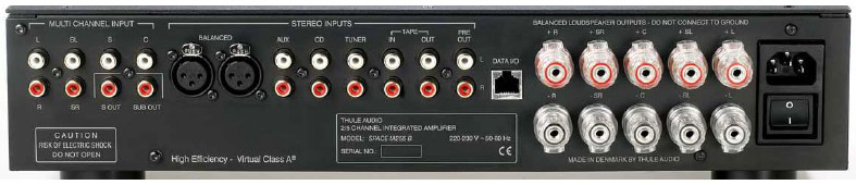 I tillegg til en balansert inngang, er IA255B utstyrt med 4 RCA-innganger samt en analog 5.1-inngang. Og siden dette er en rent analog forsterker, finnes det selvfølgelig ingen prosessor. Konseptet her er at DVD-spiller tar seg av alt som trengs av dekoding og prosessering, og signalet overføres til forsterkeren via 5.1-inngangen. Den eneste form for innstilling som gjøres i forsterkeren, er innbyrdes nivåregulering av Thule har forresten gjort en egen vri, ved at forsterkeren er utstyrt med 2 forskjellige sub-utganger. Den ene utgangen bare videreformidler det som ligger inne på LFE-kanalen (eller sendes dit via bassmanager i DVD-spiller), mens den andre utgangen er et summert signal fra frontkanalene, og må lavpassfiltreres i subwoofer eller eksternt delefilter.