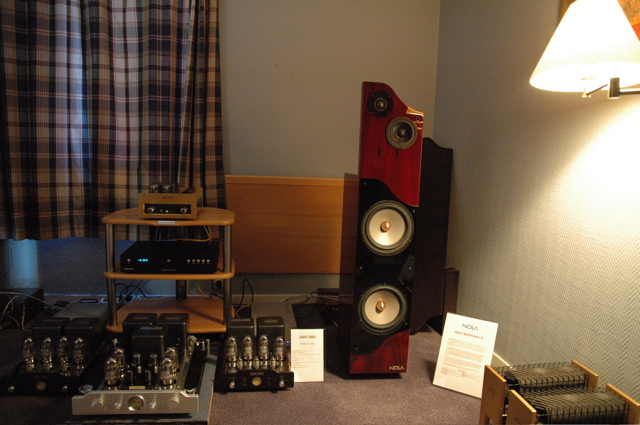 Importøren Pure Sound hadde også teke turen frå Os utanfor Bergen. Dei var noko vekkgjøymt på eit lite rom, men publikum fann fram. Dei var sikkert ikkje like stressa som Arve og meg, som skulle rekka alt. Bassen var verkeleg ei utfordring i dette rommet, sidan høgttalarane, eit sett golvståande Nola med to bassar kring 8” , går ned til 28Hz. Men sidan dette er eit lukka kabinett gjekk dette fint, om ein ikkje skrudde for høgt opp. Inn gjennom vindauget bak anlegget skein sola, og blenda deg litt i forsøket på å opna augene for lyden bak og mellom høgttalarane. Når utstillaren var ute for ein røyk, og eg lova å passe anlegget i mellomtida, nytta eg høvet til å trekkja for gardinene, og kunne hygga meg med god lyd frå pure sound CD-spelar (ca 12.000,-) og Audio Space forforsterkar og CI Audio effektforsterkarar. Sistnemnde er visstnok nye 500W monosteg, switch-mode, men med trafo (analog straumforsyning).