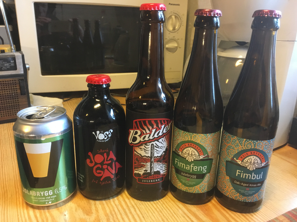 Voss Fellesbryggeri Jolagåva 6,5%: Tydeleg lukt og smak av “jolatre”, som synte seg å vera nellik, i fylgje etiketten. Kanel og vanilje (framleis i fylgje etiketten) var mindre framtredande. Terningkast 4.